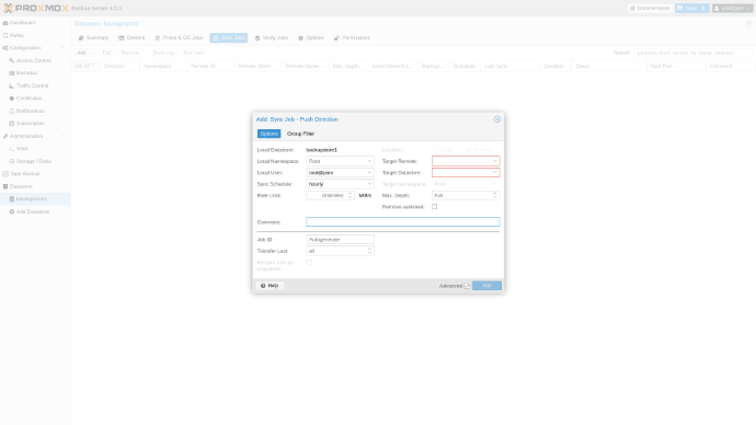„Proxmox Backup Server“ leidžia sinchronizuoti duomenų saugyklas skirtinguose geografiniuose taškuose, kad būtų užtikrintas aukštas pasiekiamumas. Tai reiškia, kad jei viena duomenų saugykla yra nepasiekiama, automatiškai kita saugykla perima atsarginio kopijavimo užduotis. Tai efektyvus būdas sinchronizuoti duomenis su nutolusiomis išorinėmis saugyklomis.